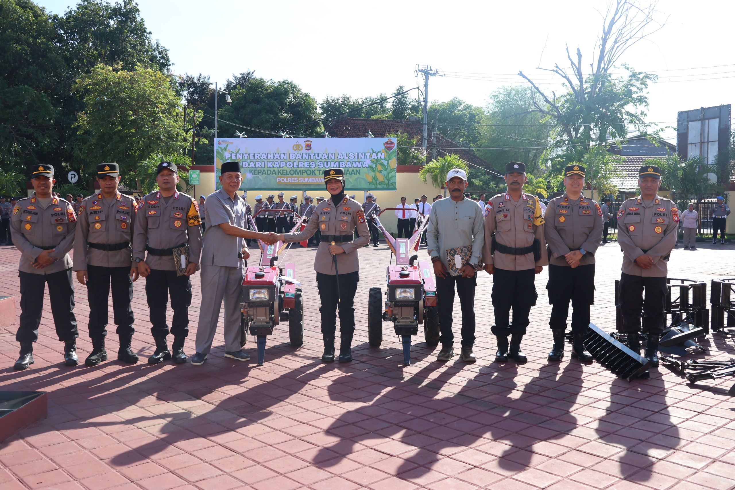 Secara khusus, Kapolres menyampaikan agenda penyerahan bantuan berupa dua unit Mesin Traktor. Bantuan Alsintan ini merupakan alokasi dari Pemerintah Daerah Kabupaten Sumbawa yang kemudian diserahkan melalui Polres Sumbawa kepada kelompok tani. Penyerahan bantuan Alsintan ini diberikan kepada dua kelompok tani binaan Polres Sumbawa, yaitu Kelompok Tani Tua Tamak dari Desa Jorok yang diwakili oleh Rusman Akang, dan Kelompok Tani Saling Santurit dari Desa Sebewe yang diwakili oleh M. Salahuddin.