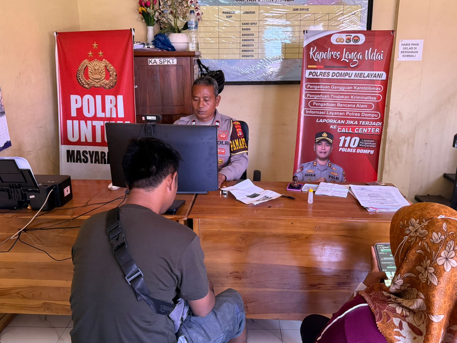 Dalam rangka meningkatkan kualitas pelayanan kepolisian kepada masyarakat, Pamapta III Polres Dompu, AIPTU Mohammad Rifa’i, melaksanakan tugas pelayanan penerimaan laporan masyarakat di ruang Sentra Pelayanan Kepolisian (SPK) Polres Dompu, pada Kamis (30/10/2025).