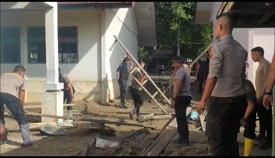 Dalam kegiatan tersebut, personel Polres Bireuen secara bersama-sama membersihkan halaman sekolah, saluran air, serta area sekitar ruang belajar. Upaya ini dilakukan sebagai bentuk kepedulian Polri terhadap dunia pendidikan sekaligus memastikan sarana dan prasarana sekolah kembali layak dan aman digunakan.