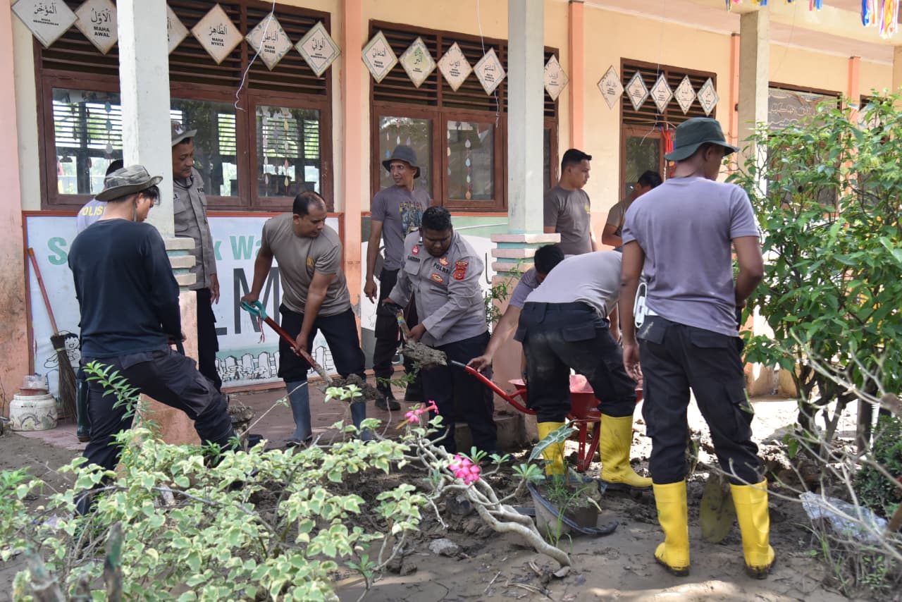 Pulihkan Sekolah Pascabanjir Bandang, Polres Bireuen Gotong Royong Bersihkan SD Negeri 11 Kutablang